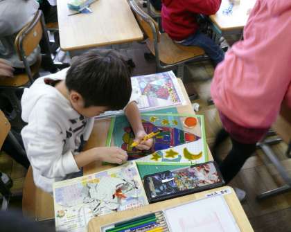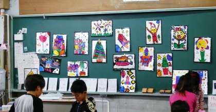 2組は図工。タックステンドを作成。完成した黒板の作品は、とてもきれいにできています。