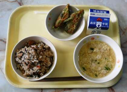 メニューは、ひじき大豆ごはん、かきたま汁、ちくわの磯辺揚げ、牛乳。