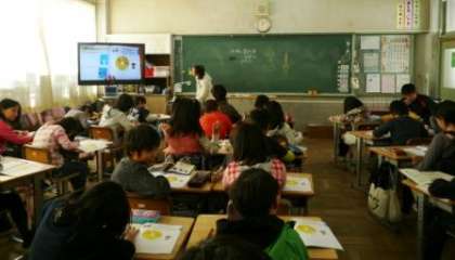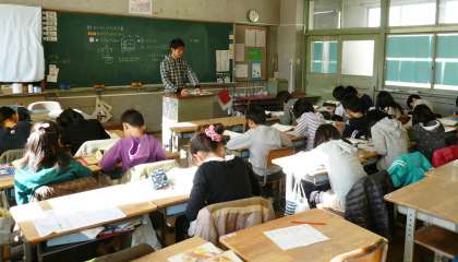 1枚目は、4年生 算数の少人数指導の様子。クラスの半分の人数で勉強しています。