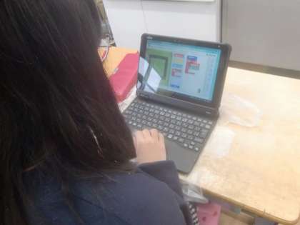 2月21日(水)、5年生は算数で「プログラミング学習」に取り組みました。プログラミングでは、プログラマーの指示通りに作品が制作されるため、オリジナル作品が出来上がります。思い思いの操作に集中して取り組む5年生です。