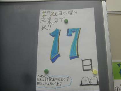 2月21日(水)、6年生の卒業カレンダーが「卒業まであと17日」となっていました。昨日はアクセスプランで本校、泉小、住道北小の3校の6年生が中学校に集いました。また、来週には卒業遠足を予定しています。1日1日を大切に、かつ、一生懸命に過ごす6年生です。