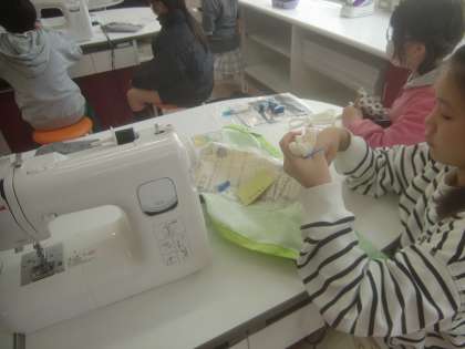 3月13日(水)、5年生は家庭科で「エプロンづくり」に取り組んでいます。真新しい家庭科室で一生懸命にミシンを操作したり、エプロンにひもを通したりしました。出来上がりが楽しみです。