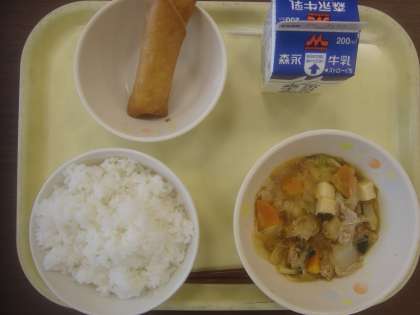 3月13日(水)の給食メニューは、ごはん、とうふチゲ、はるまき、牛乳です。今日は、熱々のとうふチゲの登場です。美味しく栄養豊かな給食に感謝の気持ちを込めて『いただきます』