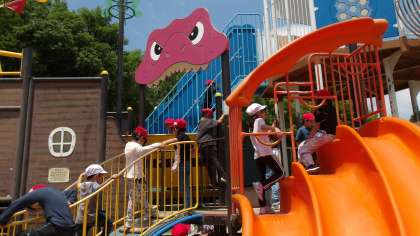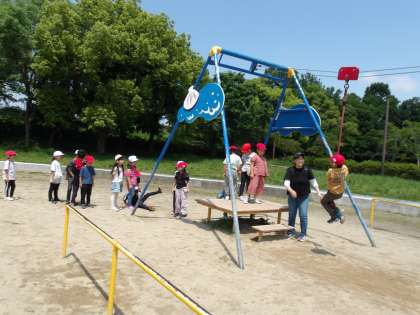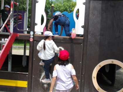 きょうりゅうの形のすべり台や、船の形の大型遊具があって、みんな大興奮でした。中でもターザンロープが人気でした。
