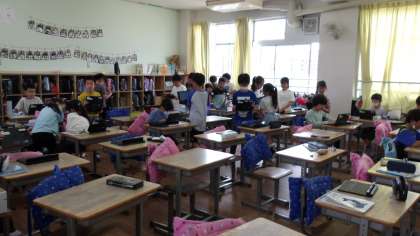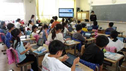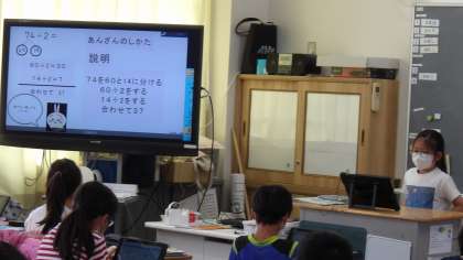 4,5,6年生の算数では、ちょっと難しい課題を、家で考えてきて、学校では友だちと考えを交流することをメインに学習を進める「反転学習」に取り組んでいます。家で考えたことは、タブレット端末に記録しておきます。その画面を使って、まずは近くの人と交流し、次にクラスのみんなの前で、説明します。画面の作り方も、人によってそれぞれで面白いです。