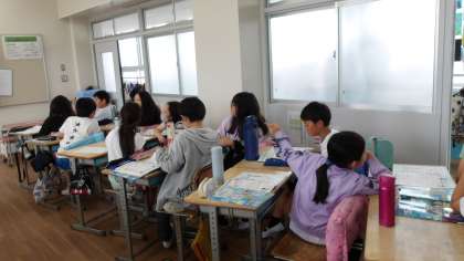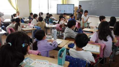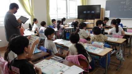 「じゃぁ、やってみよう」と先生が言うと、みんなが隣の人とお互いに英語で質問しあっています。