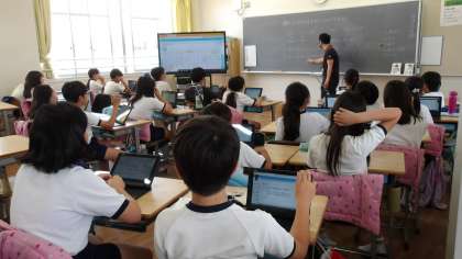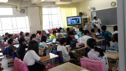 4−1では、プレゼンテーションソフトの使い方を勉強しています。4−2では、算数で、自分の考えを説明するところかな?もはや、タブレットパソコンが文具のように当たり前のように使われています。