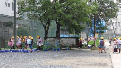 それでも子どもたちは自分の植えた朝顔や野菜が気になるようで、畑や植木鉢を見に行っています。さっきは高学年らしき子が、倒れた植木鉢を起こしている様子が見えました。命あるものを大切にする心はすてきですね。