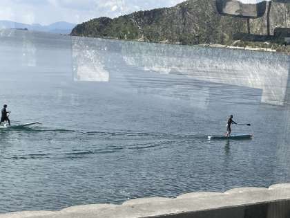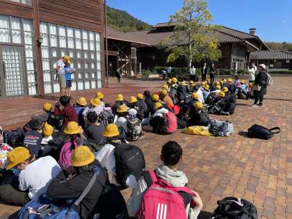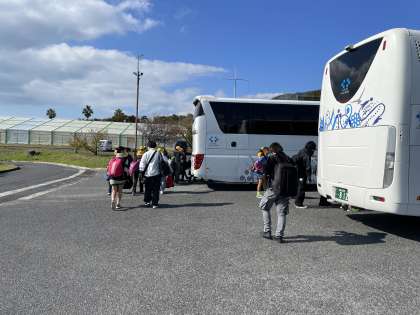 いよいよ呉を後にして大阪へ向かいます。宿舎のみなさんにお礼を言って、バスに乗り込みました。バスの窓から海の方を見ると、海の上からカッターの指導員の方がお見送りをしてくれていました。楽しい二日間をありがとうございました!