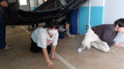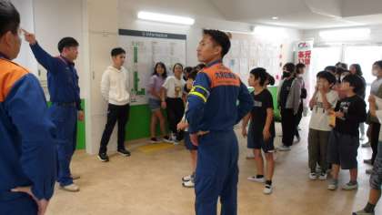 火災時の避難についての説明を聞いてから、火災による毒ガスを避けて避難する練習をしたり、避難経路誘導灯などの設備の説明をうけたりしました!消防署のみなさん、ありがとうございました!