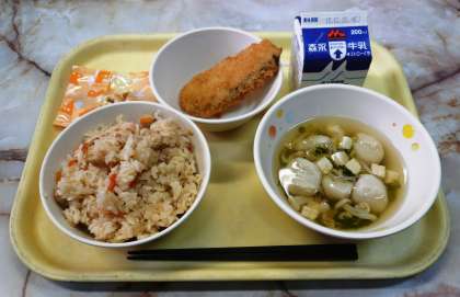 メニューは、切干し大根ごはん、五目汁、サーモンフライ、ミックスナッツ、牛乳。