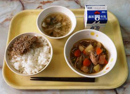 メニューは、鶏じゃが、船場汁、じゃこの炒り煮、ごはん、牛乳。