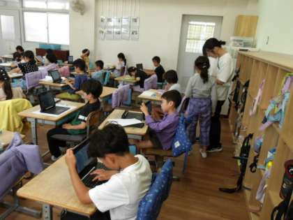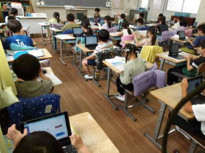 全体練習のあとの授業の様子です。課題ができたら先生にみてもらって、そのあとはPCで各自学習しています。AIドリルは便利ですね。