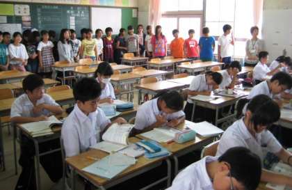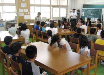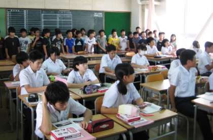 はじめに図書室で古庄校長先生と担当の先生から説明があり、その後、1年1組から3年5組まで全部の授業を見学しました。