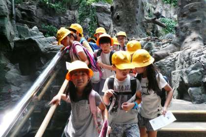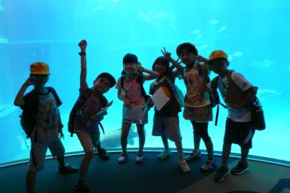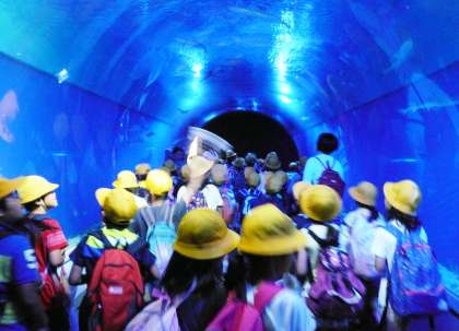 海中トンネルをくぐり、海遊館の中に入り、班毎に協力して見学しました。
