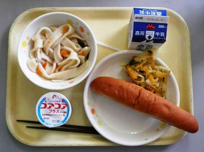 メニューは、きしめん、夏野菜のかきあげ、ヨーグルト、フィンガーパン、牛乳。