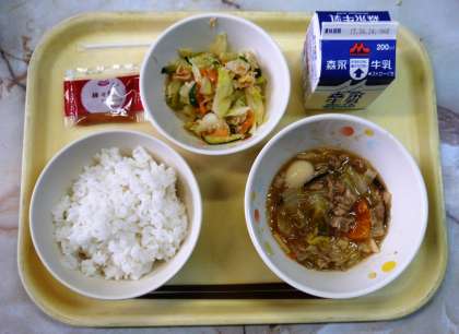 メニューは、八宝菜、バンバンジーサラダ、バンバンジードレッシング、ごはん、牛乳。