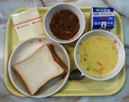 メニューは、ミートサンド、ポタージュスープ、スライスチーズ、食パン、牛乳。