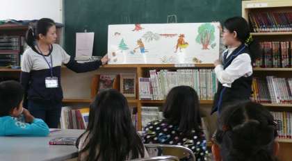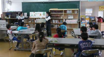 学校の図書室で、大東市立中央図書館の方に絵本の読み聞かせをしていただきました。