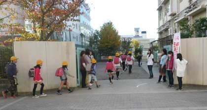 児童会役員の子どもたちは、「おはようございます!」と元気よく挨拶をしました。保護者の方に見守られ、登校して来た子どもたちも、元気にあいさつをしました。