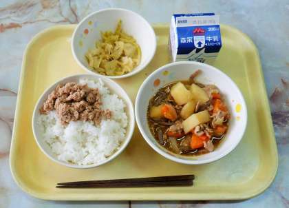 メニューは、豚肉のごま煮、キャベツの和えもの、シーチキンのそぼろ煮、ごはん、牛乳。