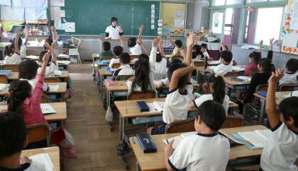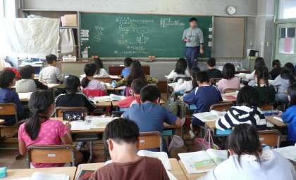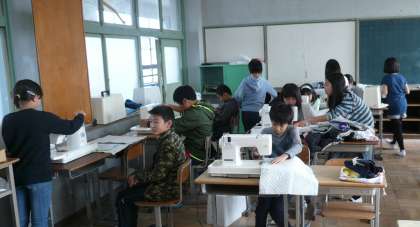 5年生 家庭科 ミシンの使ってナップサックを作っています。