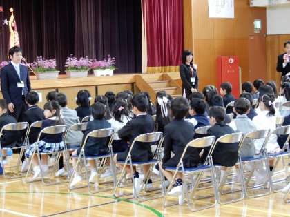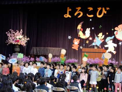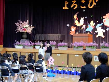 校長先生がお祝いの言葉で、1年生に「友だちいっぱいつくりたい人」とたずねると、みんな「はーい!」と元気に返事をしました。