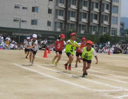 4年生の「つなげバトン 全力リレー」は生き生きとハッスルして走る姿に感動しました。結果発表でも、たすきをかけた最終ランナーが元気に返事をしました。