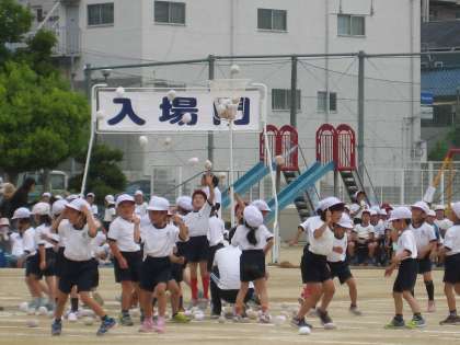 1年生の「チェッコリ玉入れ」は「チェッ、チェッコリー、チェッコリー…」の音楽に合わせて踊る姿がとてもかわいらしく、その後すぐに玉を投げ入れる面白さがありました。