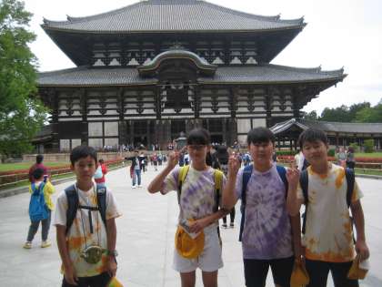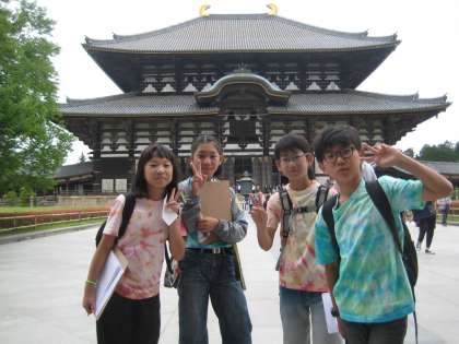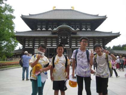 大仏殿前のチェックポイントで先生からサインをもらった班から記念撮影しました。