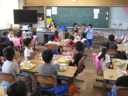 1年生のひとクラスが配膳を終えて、「いただきます」をしています。