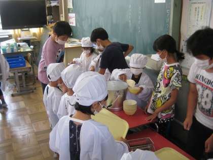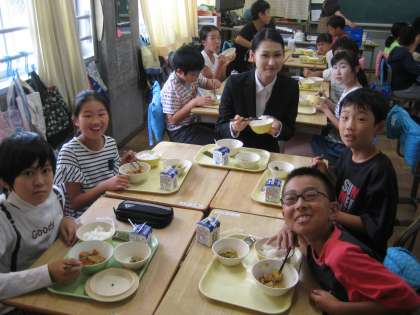 5年生のひとクラスには、本校卒業生の教育実習の先生が来て、一緒に給食を食べています。