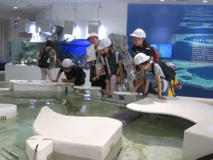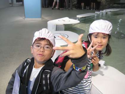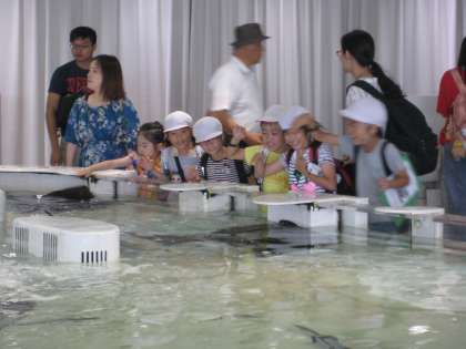 生き物に触るのは、ちょっと勇気がいりますが、思い切って「エイッ!」とエイに触っていました。ざらざらしたサメの背中ですが、よく触ってみると、「プニョッ」とやわらかいところがあるのに気づいた子もいました。