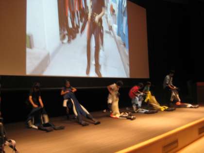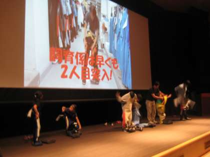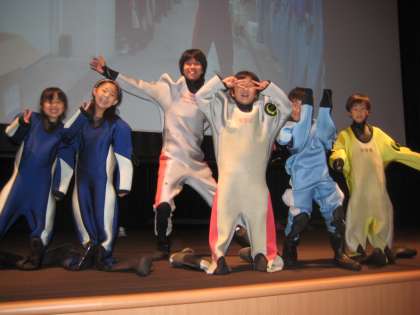 画面の飼育員さんと、ウエットスーツを着るのが、どちらが速いか競い合いました。