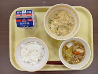 献立は、中華丼と中華風たまごスープと牛乳 です。丼の具をごはんにかけると、2...