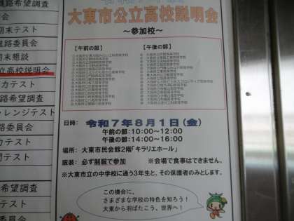 大東市立の中学校に通う3年生とその保護者を対象として、8月1日(金)に大東市公立高校説明会が行われます。時間は午前の部が10時〜12時、午後の部が14時〜16時です。場所は大東市立市民会館(2階キラリエホール)です。公立高校30校の学校説明会が行われます。ふるってご参加ください。
