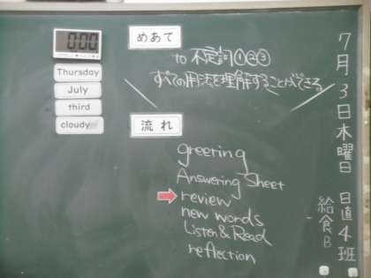 学習内容は「不定詞」でした。授業のめあては「to 不定詞1,2,3のすべての用法を理解することができる」でした。テストが終わっても、気を抜くことなく、子どもたちは授業を受けていました。