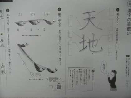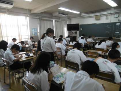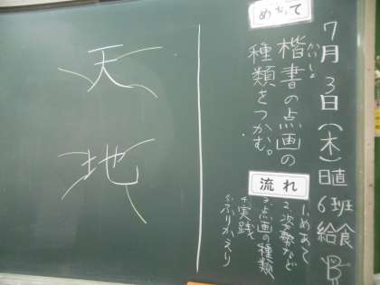 授業のめあては「楷書の点画の種類をつかむ」でした。子どもたちは、教科担当の先生から出された作業を黙々と行っていました。