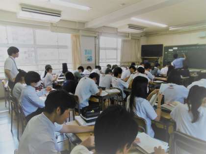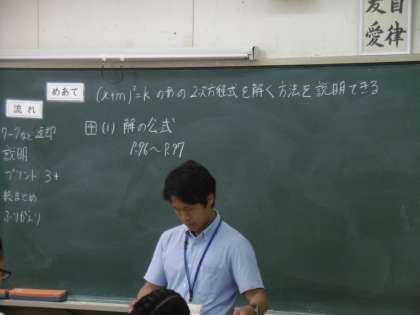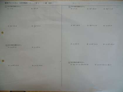 授業のめあては「(χ+m)²=kの形の2次方程式を解く方法を説明できる」でした。子どもたちは配られたプリントを静かに、一生懸命に解いていました。切り替えの早さに感心しました。