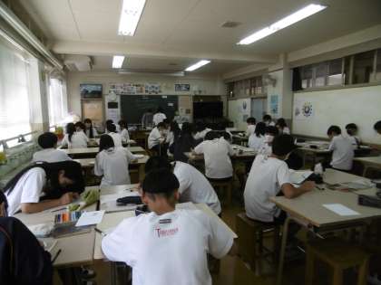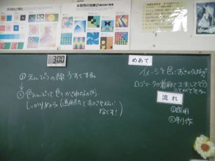 授業のめあては「イメージを色におきかえながら、ロゴマークの着彩を工夫して行うことができる」でした。課題に対して本当に一生懸命に向き合っている46期生を見ていて感心しました。