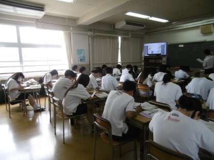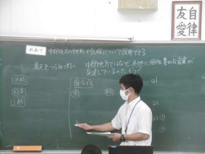 授業のめあては「中部地方の地形や気候について説明できる」でした。本当に静かな教室でした。先生から出された課題を黙々と取り組んでいました。