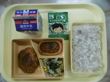 今日のメニューは、もち麦ごはん、チキンカツソースかけ、なすとトマトのグラタン、ポパイソテー、ふりかけ、牛乳です。