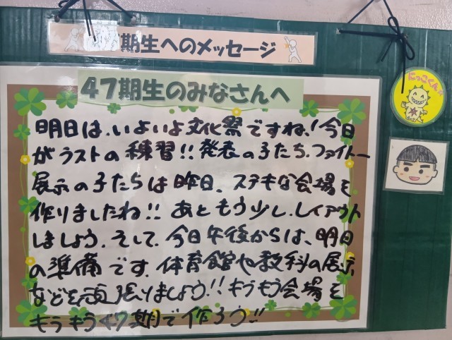 明日の文化祭で発表する47期生へのメッセージが書かれていました。2年生の一生懸命に発表する姿を期待しています。
