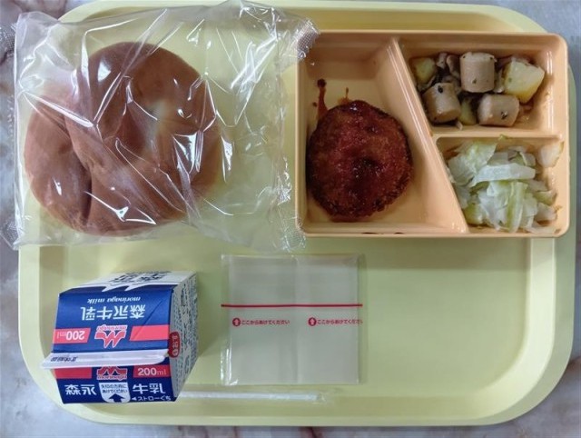 今日のメニューは、バーガーパン、豚カツソースかけ、ソーセージときのこのアヒージョ風、キャベツソテー、スライスチーズ、牛乳です。