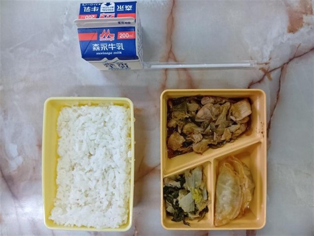 今日のメニューは、白ごはん、鶏のホイコーロー、揚げギョーザ、青菜の油炒め、牛乳です。