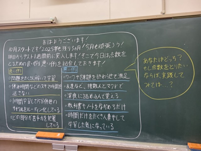 明日からテスト1週間前になります。部活動もありません。1組の担任の先生がテスト勉強について、昨年度の3年生担任という経験も踏まえて、朝の学活で生徒に話をしていました。