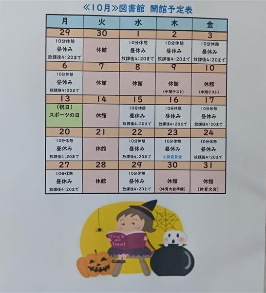 10月の図書館開館予定です。体育大会の開催で予定が変更になる場合があります。