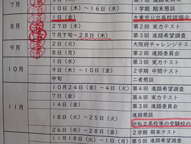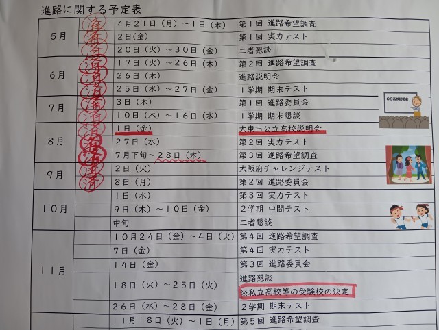 3年生が過ごす2階廊下に掲示されている「進路に関する予定表」です。本日が第3回実力テスト。着々と予定が進んでいます。先を見据え、しっかりと計画を立てておきましょう。