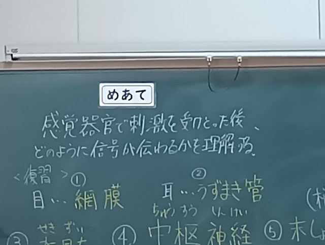 授業のめあては、「感覚器官で刺激を受けとった後、どのように信号が伝わるかを理解する」でした。明日からテスト1週間前になります。計画的に勉強を進めていきましょう。