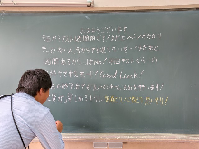 朝、校内を回っていると、1年1組の担任の先生が黒板にメッセージを書いていました。